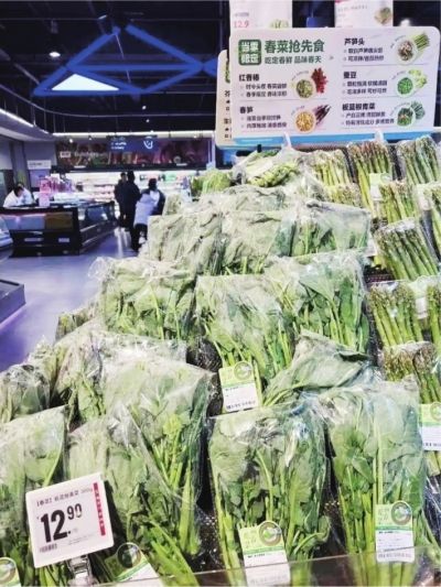 21日中午,记者走进武汉市的盒马鲜生岳家嘴店看到,板蓝根青菜被摆放在春菜品类的显眼位置,不时有市民前来选购。“第一次看到这种蔬菜,感觉很新奇,名字听起来挺养生健康的。”“90后”武汉市民张欣看到春菜上新,打算买些尝尝鲜。