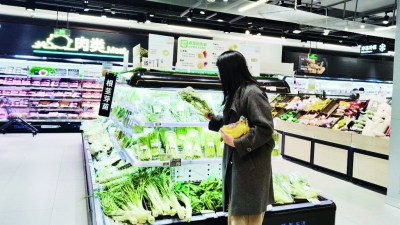 消费者在武汉市盒马鲜生岳家嘴店内选购板蓝根青菜。