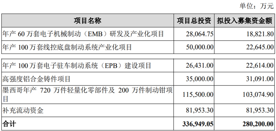 伯特利2024年10月25日披露的关于向不特定对象发行可转换公司债券预案(修订稿)显示,公司本次发行的可转债募集资金总额不超过人民币280,200.00万元(含280,200.00万元),扣除发行费用后,募集资金净额将用于年产60万套电子机械制动(EMB)研发及产业化项目、年产100万套线控底盘制动系统产业化项目、年产100万套电子驻车制动系统(EPB)建设项目、高强度铝合金铸件项目、墨西哥年产720万件轻量化零部件及200万件制动钳项目、补充流动资金。