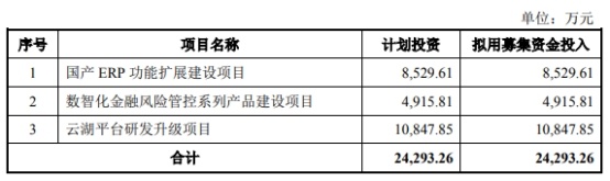 本次发行的可转债所募集资金总额不超过24,293.26万元(含本数),扣除发行费用后拟用于以下项目:国产ERP功能扩展建设项目、数智化金融风险管控系列产品建设项目 、云湖平台研发升级项目。
