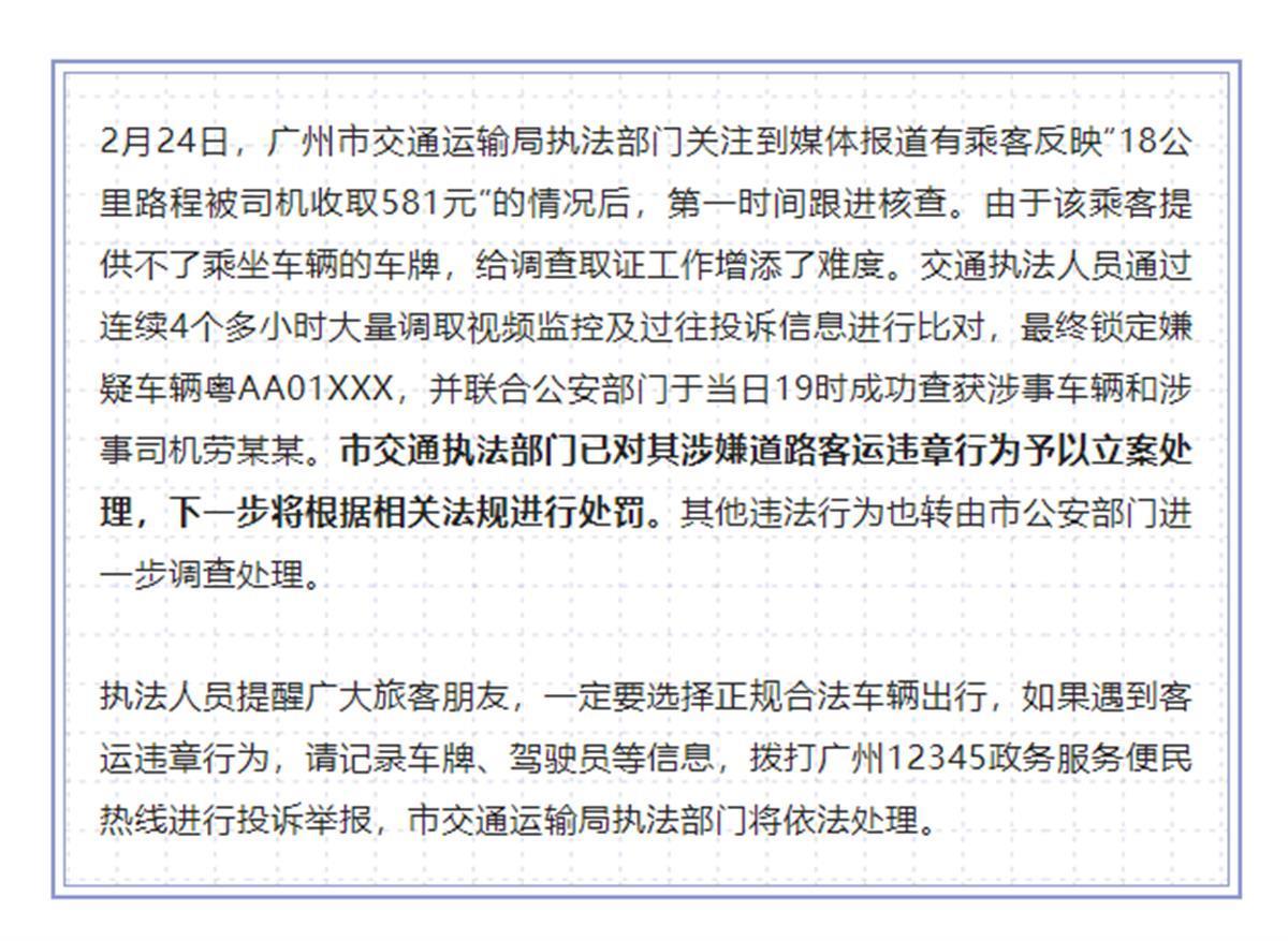 2月24日晚,广州市交通运输局发布通报称,关注到媒体报道有乘客反映“18公里路程被司机收取581元”的情况后,第一时间跟进核查。通过连续4个多小时大量调取视频监控及过往投诉信息进行比对,最终锁定嫌疑车辆粤AA01XXX,并联合公安部门于当日19时成功查获涉事车辆和涉事司机劳某某。(据2月24日羊城晚报报道)
