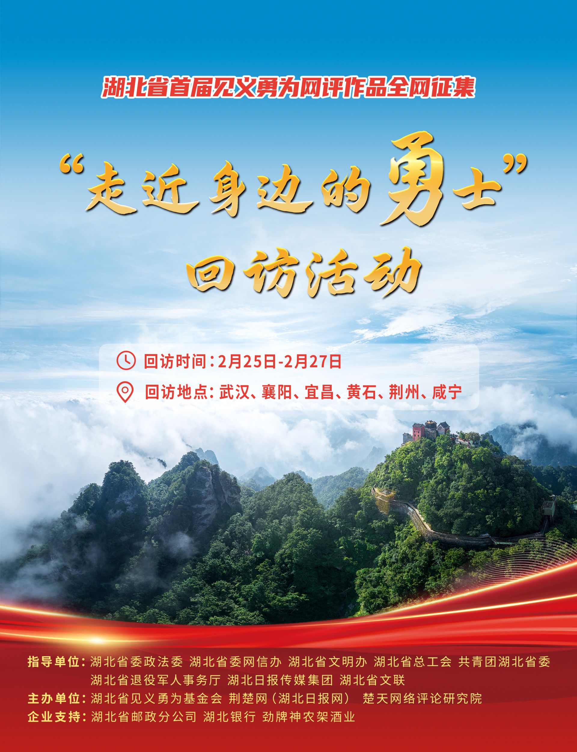荆楚网(湖北日报网)讯(记者 邱玲鹏、周光洁 通讯员 黎卓新、黄子宸)为进一步弘扬社会正气,传递社会正能量,充分彰显荆楚大地见义勇为英雄的崇高精神,2月25日,由湖北省委政法委、省委网信办、省文明办、省总工会、共青团湖北省委、省退役军人事务厅、湖北日报传媒集团、省文联共同指导,湖北省见义勇为基金会、荆楚网(湖北日报网)、楚天网络评论研究院联合主办的湖北省首届见义勇为网评作品全网征集“走近身边的勇士”回访活动在楚天传媒大厦正式启动。