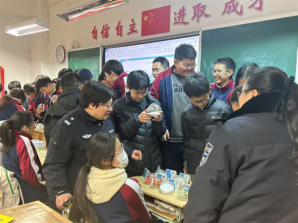 积玉桥派出所张警官则通过真实案例剖析,将晦涩的法律条文转化为生活场景。现场设置的毒品模型展示区,学生们紧盯细节特征,自发记录辨别要点,争相通过气味、包装等细节辨识仿真毒品模型。