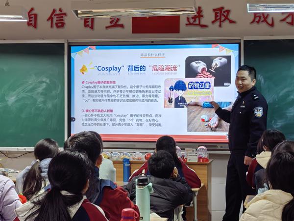 “Cosplay圈子本身就充满复杂性,许多青少年模仿的角色来自日本动漫,而这些动漫作品中也不乏色情、擦边、暴力等元素。”活动现场,禁毒大队陈警官以“毒品是什么”为切入点展开教学,同学们通过PPT直观地了解毒品的各种形态,对传统和新型毒品的认知不再停留在模糊的概念上。在“怎么区分药和毒”环节,陈警官结合生活实例,详细介绍了两者的区别,告诫同学们要严格遵医嘱用药,切勿滥用药品,避免因无知而陷入毒品的陷阱。