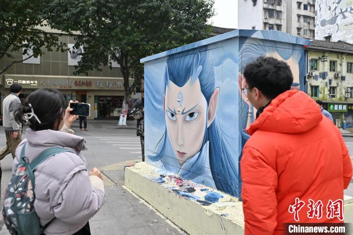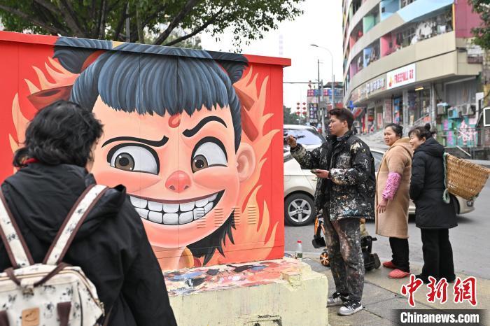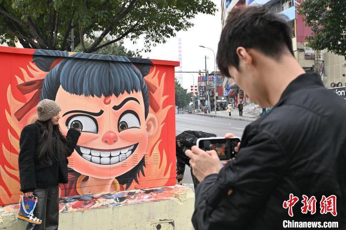 图为电影角色“哪吒”涂鸦吸引游客拍照。中新社记者 何蓬磊 摄