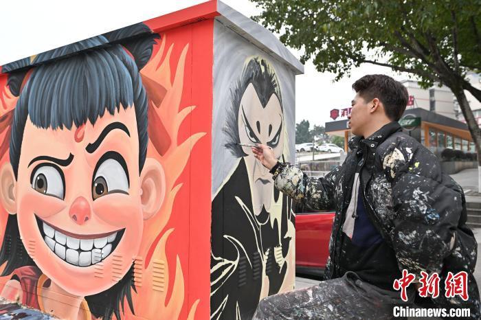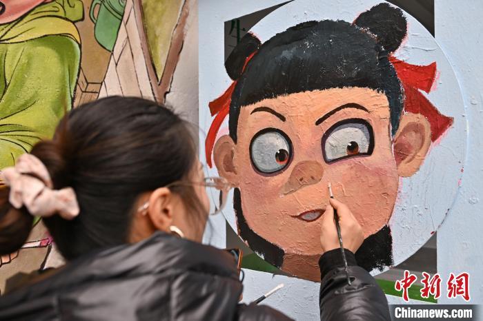 图为绘画者在绘制电影角色“哪吒”涂鸦。中新社记者 何蓬磊 摄