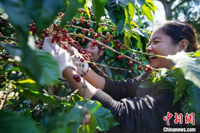正值咖啡鲜果成熟季,普洱市云南北归咖啡有限公司南岛河种植基地里,农户们正在咖啡树间采摘鲜红饱满的咖啡鲜果。这些鲜果经过清洗、脱皮、脱胶、烘干、晾晒等数道工序后,将被装车运往世界各地。
