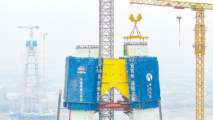 2月13日,中国铁建大桥局建设者在荆州观音寺长江大桥北岸主塔顶部进行上部钢壳-混凝土塔柱施工。 (湖北日报全媒记者 柯皓 通讯员 秦克明 摄)
