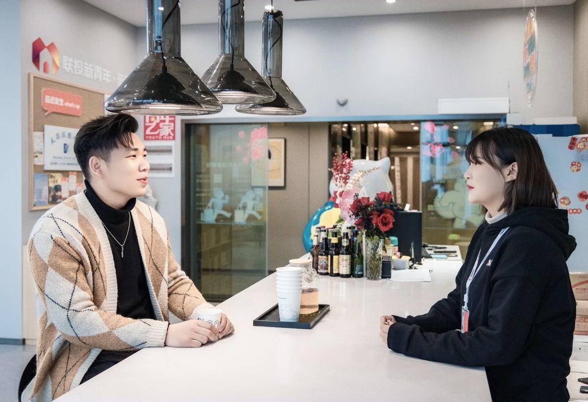 胡瑞(左)在联投新青年·奕家项目的共享客厅与运营官周雪平交流。 (湖北日报全媒记者 成熔兴 摄)