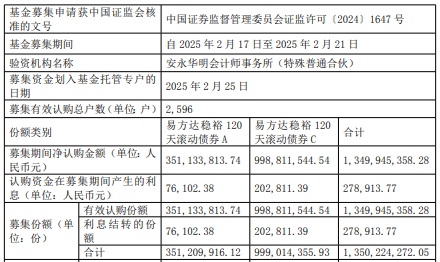募集期间净认购金额1,349,945,358.28元,认购资金在募集期间产生的利息278,913.77元,募集份额合计1,350,224,272.05份。