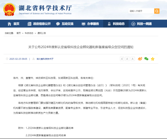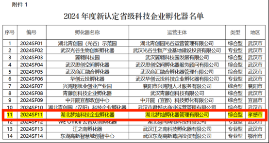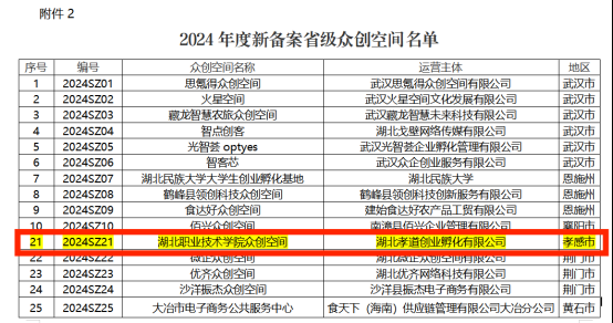 荆楚网(湖北日报网)讯(通讯员关胜波)2月25日,省科技厅公布2024年度新认定省级科技企业孵化器和新备案省级众创空间,孝南区湖北梦灿科技企业孵化器被认定为省级科技企业孵化器,湖北孝道创业孵化有限公司的湖北职业技术学院众创空间成功备案为省级众创空间。