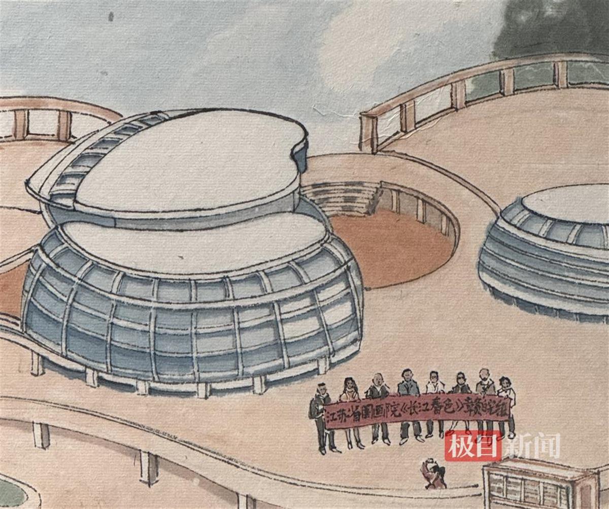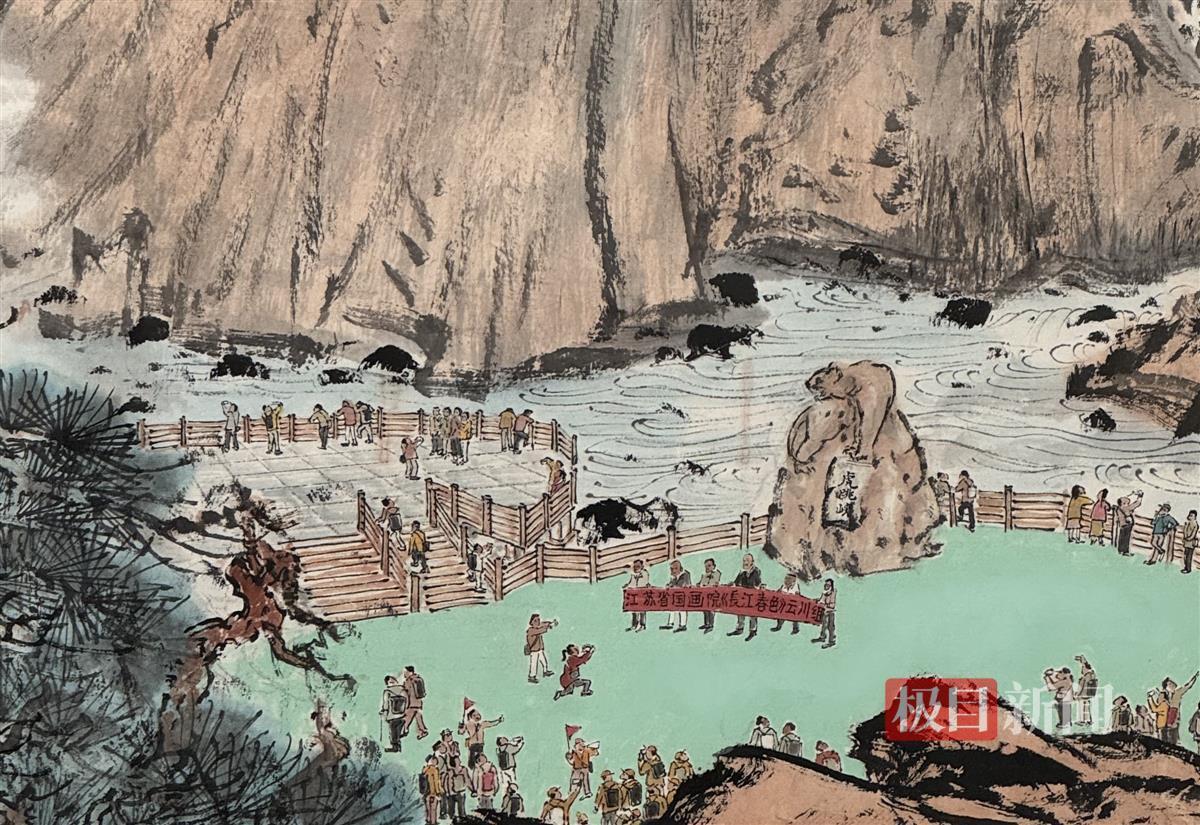 特别有趣的是,记者还发现了几个更为隐藏的“彩蛋”:在几处描绘人们在景区或地标建筑前打卡留念的场景中,画中人物的手里拉起横幅,写着“江苏省国画院长江春色云川组”“江苏省国画院长江春色赣皖组”等字样。原来,创作者们悄悄把自己也藏在了这件作品当中,也让人忍不住联想到,他们在长江沿线采风的过程,让人觉得格外有趣。