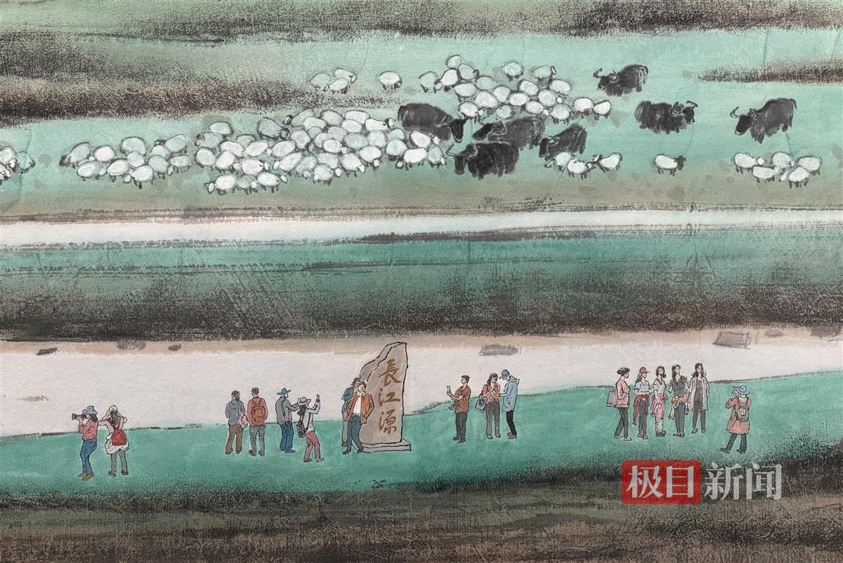 市民杨老师和夫人,曾游历过长江沿线不少省份。他们告诉极目新闻记者,画作中有很多熟悉的场景,观展过程勾起了很多美好的回忆。“长江源我们大概是十多年前去的,当时的感受是非常震撼的。在这幅画作中,再次看到了长江源,让我的心情又激动了起来。”杨老师说,“还有三峡大坝、南京长江大桥、上海东方明珠……回忆都回来了!”