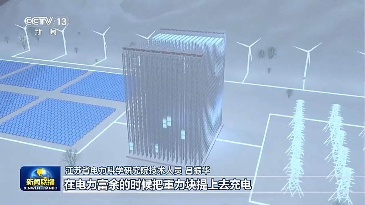 江苏省电力科学研究院技术人员 吕振华:这个大楼里一共有96部“电梯”,共同组合成48个单元模块同时作业,在电力富余的时候把重力块提上去充电,用电高峰的时候把重力块放下来向电网放电,4小时就可以发10万度电。