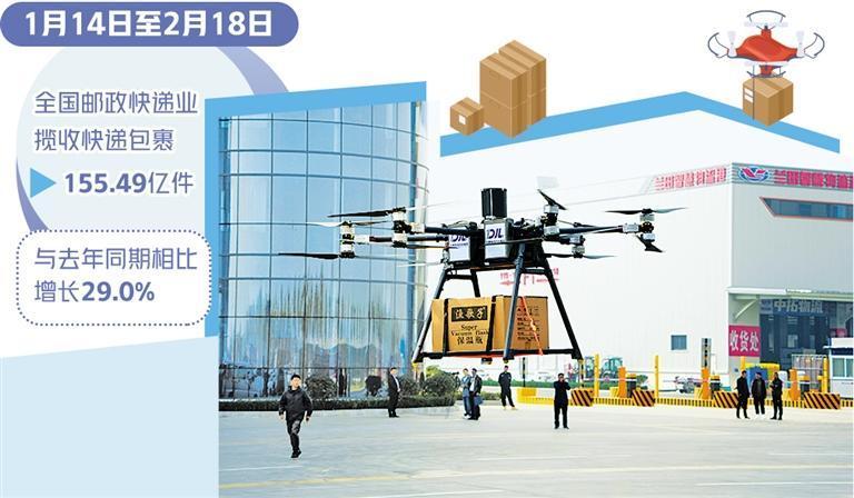 邮政快递业连接线上线下、服务千城百业,是经济运行的“毛细血管”。国家邮政局监测数据显示,1月14日至2月18日,全国邮政快递业揽收快递包裹155.49亿件,与去年同期相比增长29.0%;投递快递包裹159.69亿件,与去年同期相比增长31.1%。