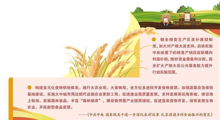 构建多元化食物供给体系,是保障国家粮食安全、建设农业强国的重要举措。习近平总书记强调,“在保护好生态环境前提下,从耕地资源向整个国土资源拓展,从传统农作物和畜禽资源向更丰富的生物资源拓展,向森林、草原、江河湖海要食物,向植物动物微生物要热量、要蛋白,多途径开发食物来源”。日前发布的中央一号文件也对此进行部署,提出“践行大农业观、大食物观,全方位多途径开发食物资源”。总的来看,构建多元化食物供给体系,需立足全局,以食物消费需求为导向,优化农业资源要素配置,拓展农业生产空间与食物供给来源。