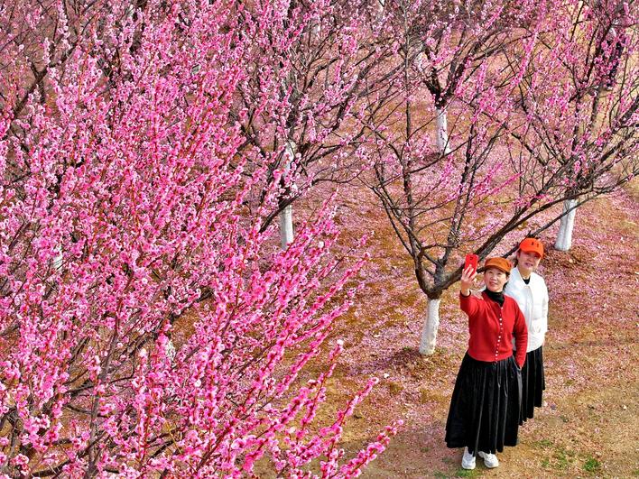 2月26日,记者在武汉青山江滩看到,建设六路路口对面的江堤上,大片梅花进入盛花期。枝头缀满娇艳欲滴的红色花朵,远远望去,如同一片片红霞,吸引了不少市民游客打卡拍照。