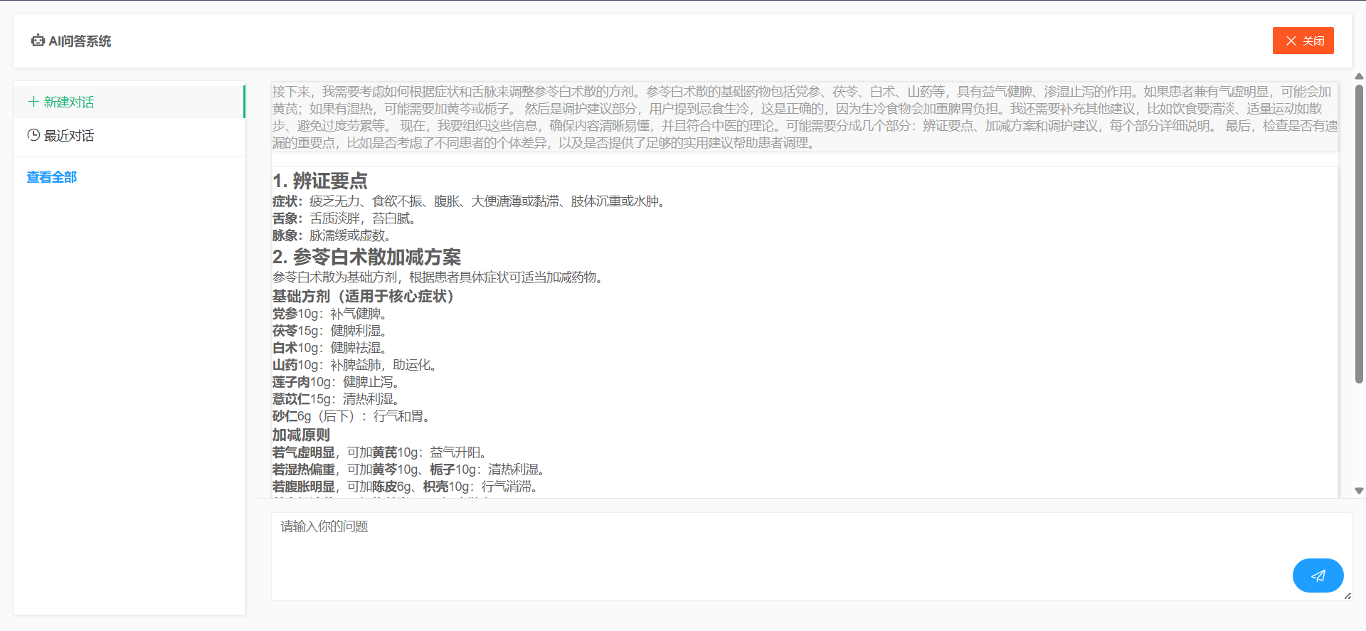 辨证论治深度求索。基于中医经典文献和名老中医经验方数据库,该院使用DeepSeek构建了中医辨证论治智能系统。例如,针对“脾虚湿困证”型患者,AI可结合症状、舌脉信息,推荐参苓白术散加减方案,并提示“忌食生冷”等个性化调护建议。临床数据显示,AI辅助决策使中医处方合理性提升了35%,尤其能帮助年轻医生快速掌握辨证精髓。
