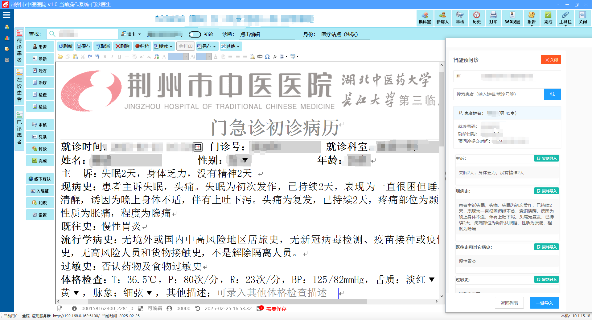 作为荆州地区首批实现DeepSeek本地化部署的三甲中医医院,荆州市中医医院将DeepSeek应用于门诊中医医疗服务中,通过AI预问诊、中医电子病历智能书写、中医辨证论治智能辅助等应用,使患者候诊时间缩短40%,科室资源分配效率提升35%,医生文书工作时间减少70%,病历完整率提升至98%。这不仅提高了医疗服务的质量和效率,也为患者提供了更加精准、高效的中医医疗服务。