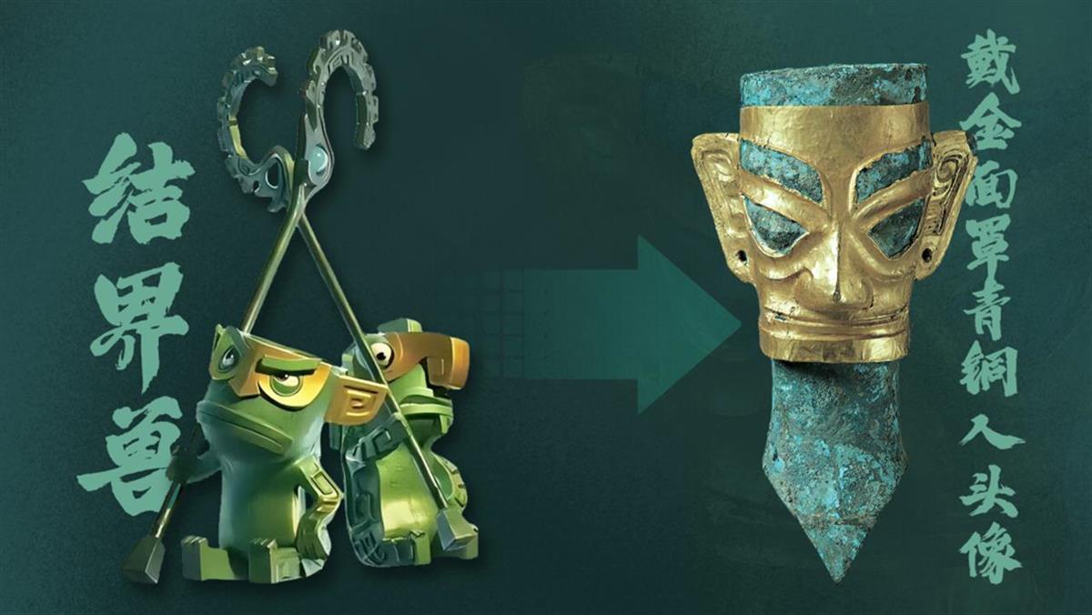这两个结界兽粗眉、大眼、高鼻、宽嘴、方形耳朵,面部覆以黄金面罩,这个造型乍一看很夸张,但常逛博物馆的人绝对很眼熟,因为它们的这些特征与三星堆、金沙遗址出土典型文物的某些元素高度契合,机智的三星堆博物馆也及时地设计了“联动海报”,让看了电影的观众会心一笑。不得不说,设计这两个角色的动画师,没少去博物馆啊。