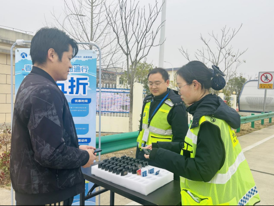 各管理所在收费广场设立ETC业务咨询台,集ETC推广发行、售后服务、便民服务和政策宣传等多项服务为一体,不断延伸服务内涵,提升公众出行体验。通过悬挂标语、发放手册及现场讲解,以“错峰出行享五折”为核心宣传点,强化司乘对ETC便捷性和优惠政策的认知,为司乘人员提供更便捷、更实惠的出行选择。同时在线上通过朋友圈扩散、抖音转发等形式进一步扩大政策影响力,普及ETC惠民政策及出行优势。