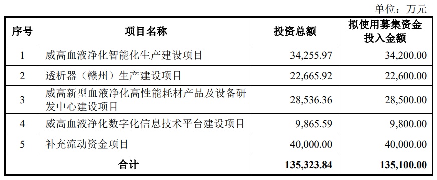 威高血净拟募集资金135,100.00万元,用于威高血液净化智能化生产建设项目、透析器(赣州)生产建设项目、威高新型血液净化高性能耗材产品及设备研发中心建设项目、威高血液净化数字化信息技术平台建设项目、补充流动资金项目。
