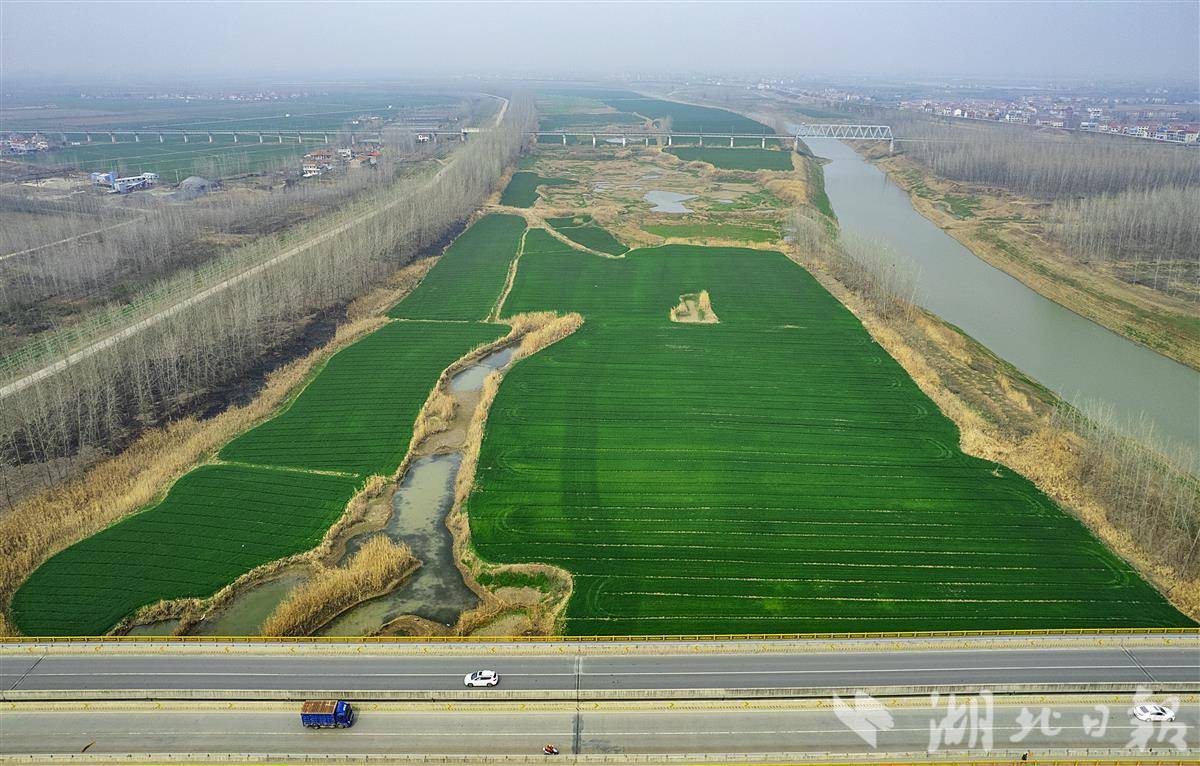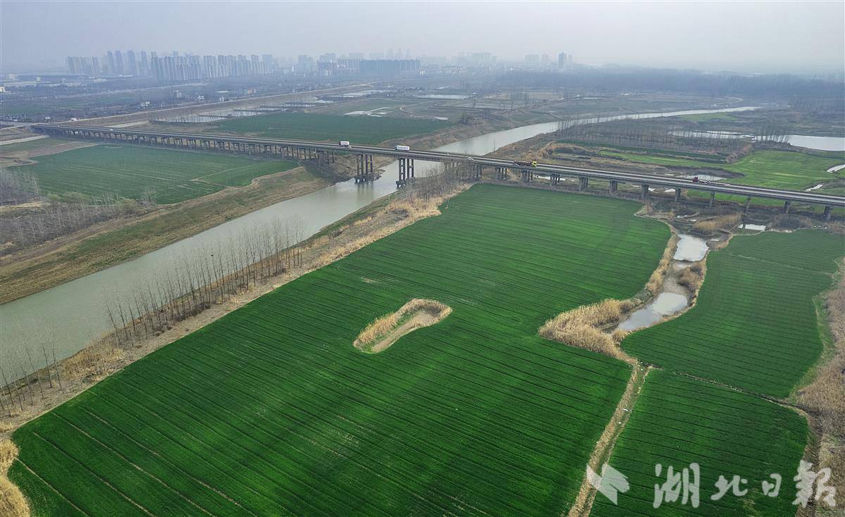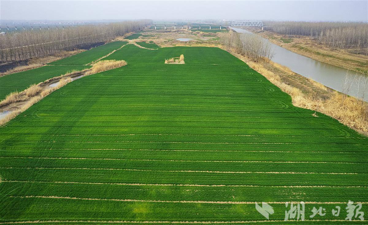 2月26日,鸟瞰武汉新洲区双柳街道大埠村举水河畔的500多亩冬小麦田,镜头下麦田绿意盎然,小麦长势喜人。