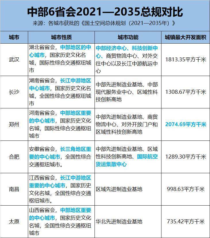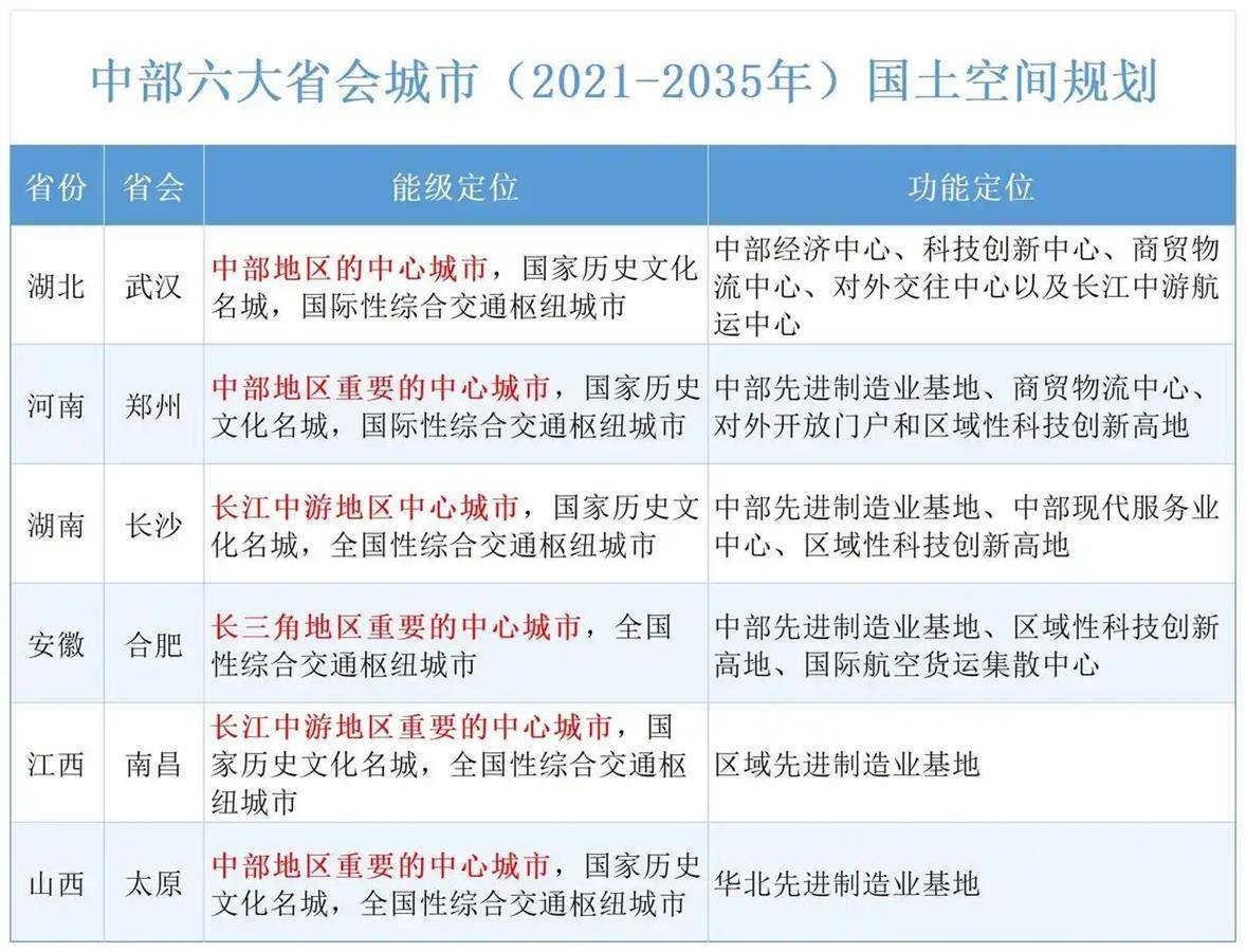 同时,中部六省的省会城市中,郑州、太原被定为“中部地区重要的中心城市”,合肥被定为“长三角地区重要的中心城市”,长沙被定为“长江中游地区中心城市”,南昌被定为“长江中游地区重要的中心城市”。