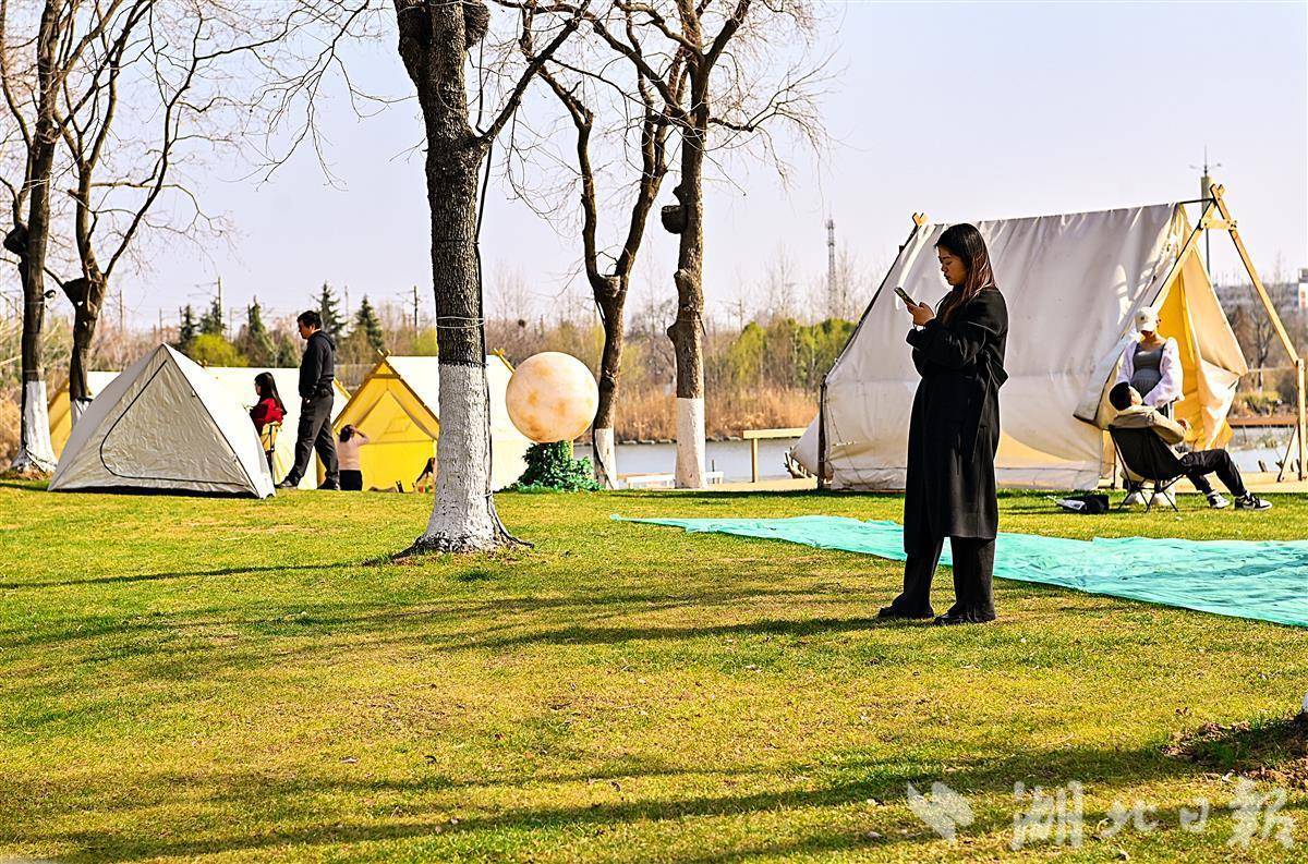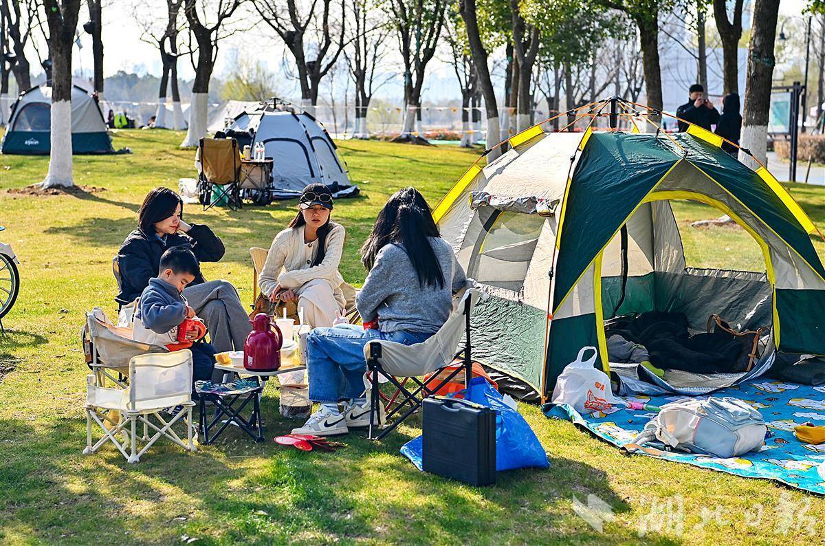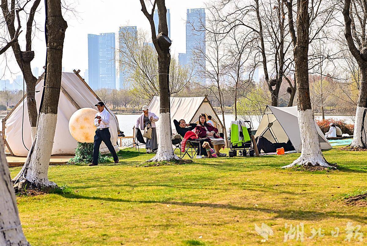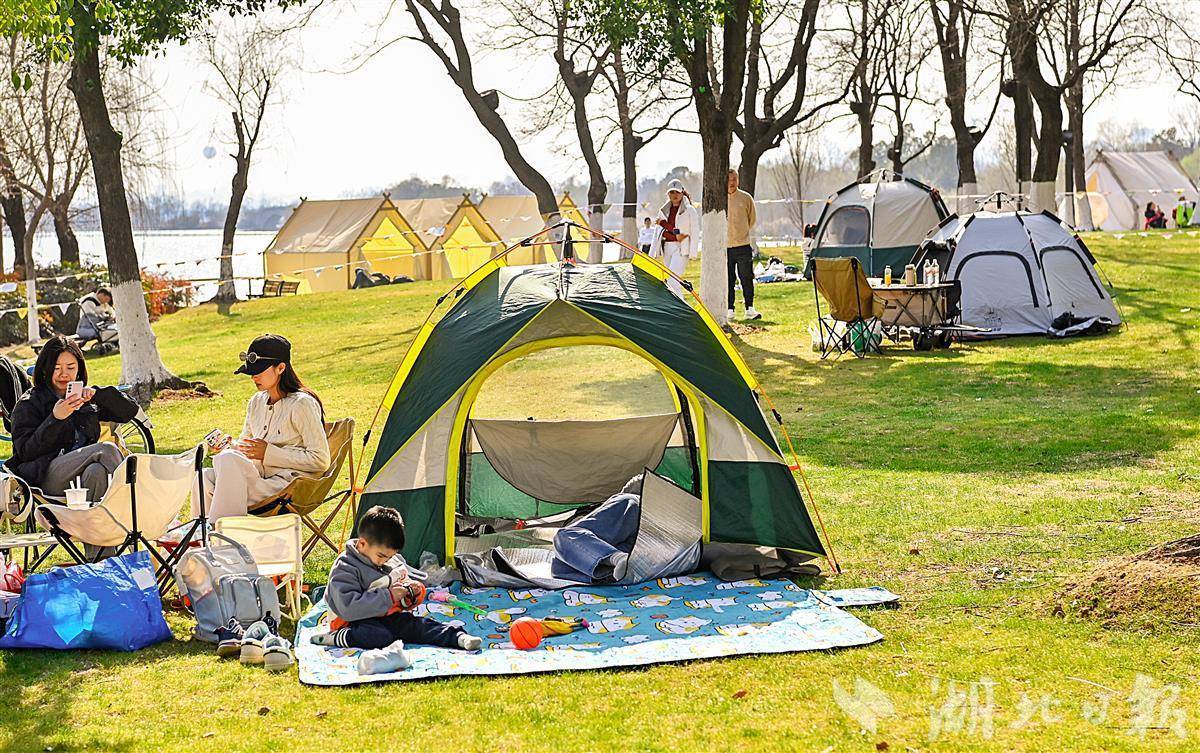 当日,许多市民游客在东湖绿道白马驿站的湖畔搭帐篷,拥抱春天。近年来,一顶帐篷几乎是家庭游在东湖踏青的标配,走进东湖绿道,有草地的地方就有帐篷。