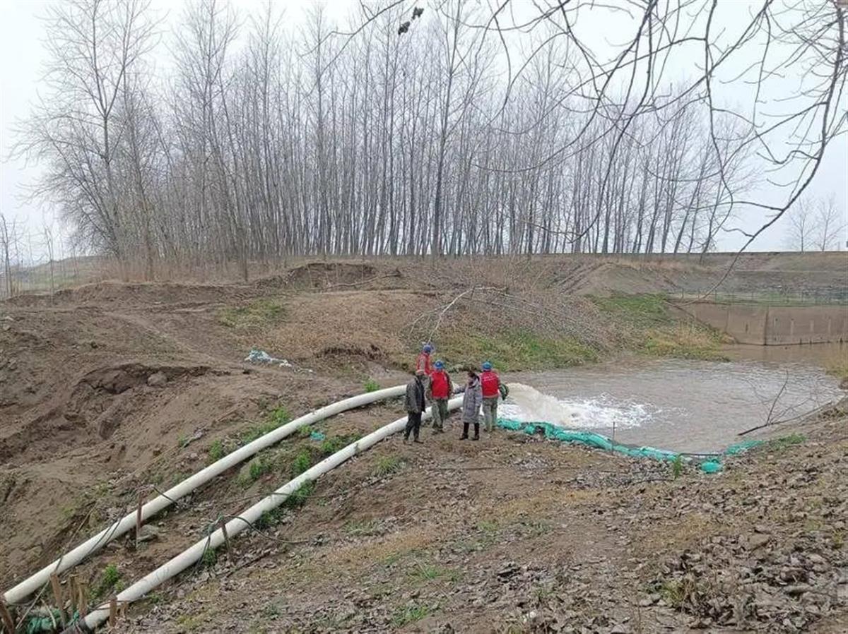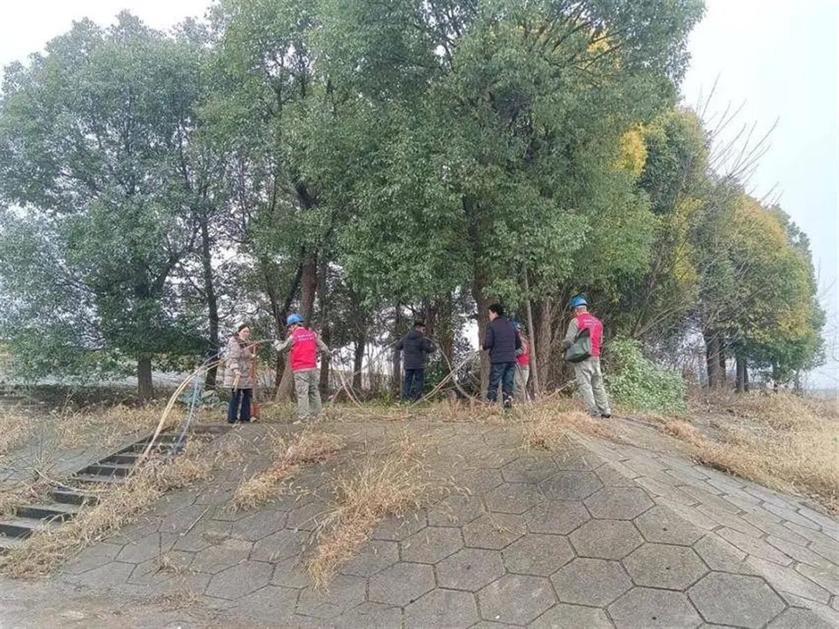 砍树枝、挖坑洞、栽杆架电线,经过两个多小时的紧张作业,成功架设临时供电抽水线路。随着潜水泵的轰鸣声响起,一股股河水源源不断地流入干涸的渠道,最终引入虾稻田,为虾苗生长提供了宝贵的水源。