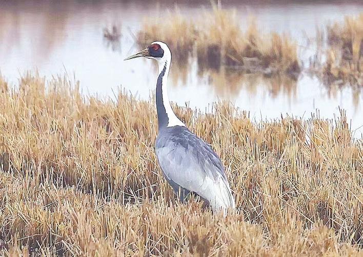 2月14日上午,鄂州市国家级陆生野生动物疫源疫病监测站工作人员在梁子湖进行日常监测时,发现一只国家一级保护野生动物白枕鹤在稻田里觅食。白枕鹤,又名红面鹤,大型涉禽,其体型略小于丹顶鹤,属于全球易危物种。目前,全球白枕鹤数量为6500只左右,我国境内约有3700只。