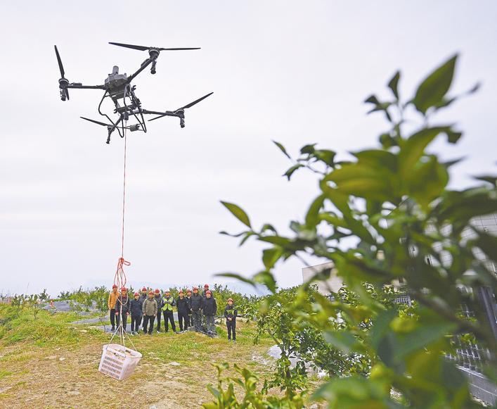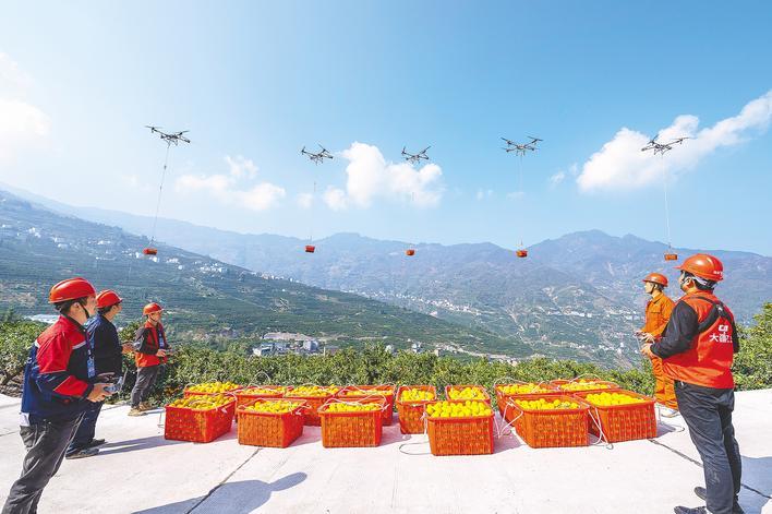 无人机旋翼轰鸣,奏响丰收乐章。它们沿着预设航线轻盈起舞,将一筐筐饱满多汁、宛如金球的红肉脐橙稳稳运出山坳。