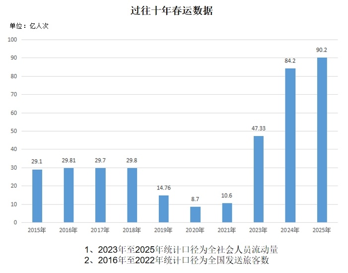 据交通运输部公布的春运数据,2025年春运全社会人员流动量截至2月22日达到90.2亿人次,同比增长7.1%,创历史新高。