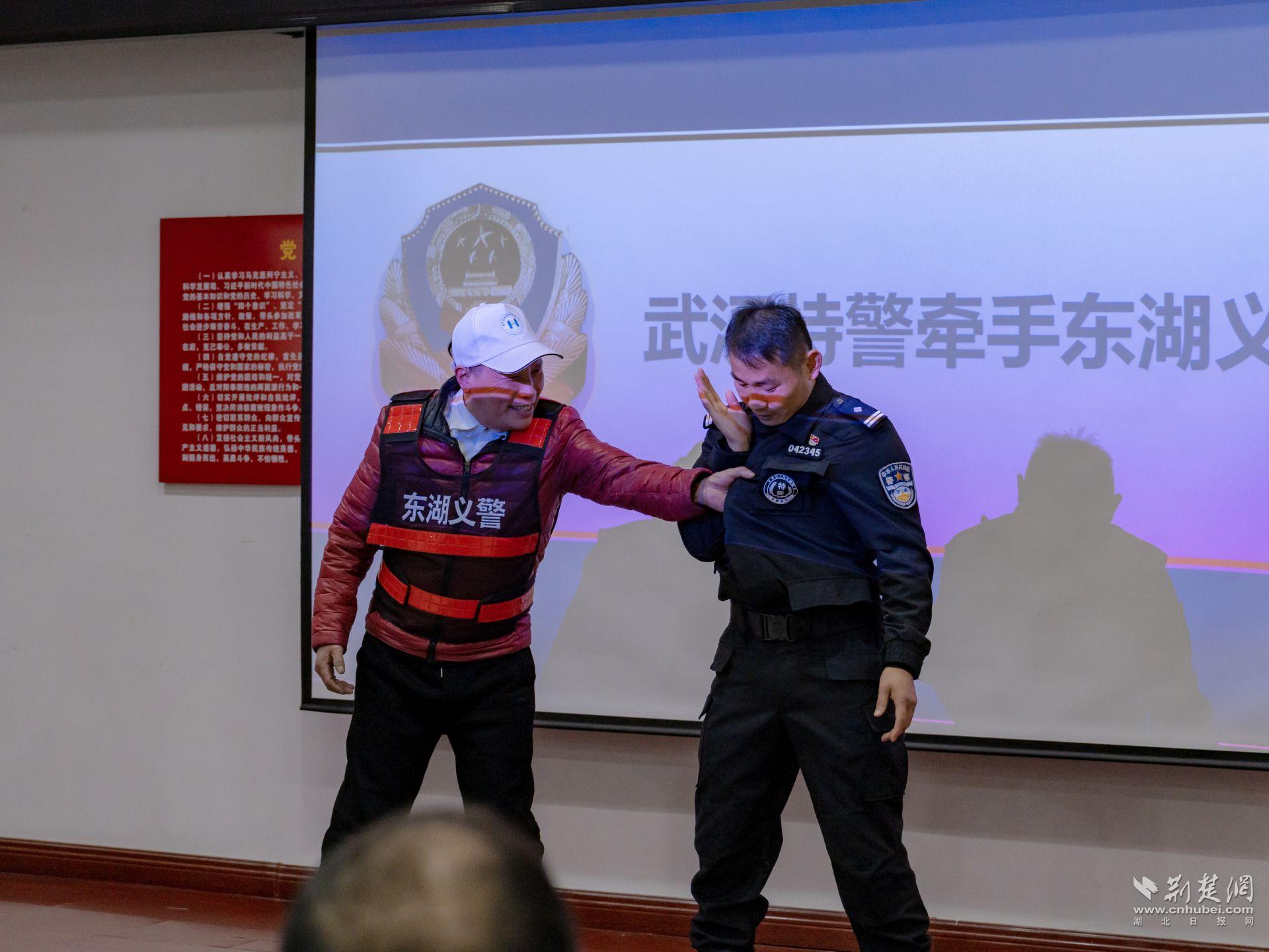 “如果有人‘抖狠’,把你衣服抓住了该怎么快速逃脱?”来自特警支队的国家级武英健将、支队驻江汉大队副大队长卢晓峰现场邀请东湖义警做起了实练实操。一、两个技巧性的反关节动作,就可以达到“以弱御强”的效果,让培训现场年龄偏大的东湖义警们纷纷叫好。