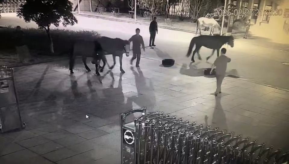2月27日21时30分许,武汉市公安局轨道交通管理分局汉新派出所辅警陈衫在所部大楼值班时,通过所部周边监控视频,突然发现所部门口出现了4匹马。陈衫赶紧将这一情况报告给值班民警余凌飞和所长苑志群。