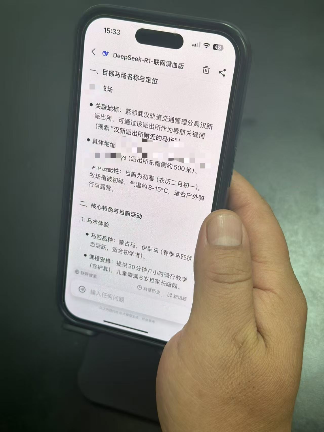 安抚住马匹后,民警紧急搜索派出所周边的马场,尝试寻找马匹的主人。这时,苑志群想到了最近在网上爆火的人工智能软件“DeepSeek”,看用它能不能帮忙查询到派出所附近的马场。根据地址位置信息输入后,结合一些要素加入,DeepSeek推送了几条附近马场的名称信息。