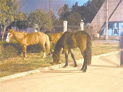 2月28日,汉新派出所辅警陈衫称,2月27日晚上9时30分许,他在所里值班时通过派出所周边监控视频,突然发现派出所大门口有几匹马在溜达撒欢。跑出去一看,果真如此。陈衫赶紧将这一情况报告给值班民警余凌飞和所长苑志群。