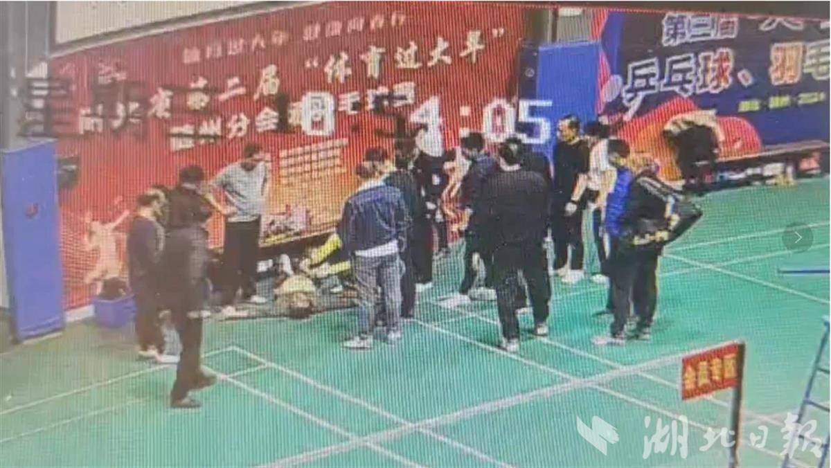 当日18:52分,健身村羽毛球馆内,2号场地上一名中年男子突然晕倒在地。