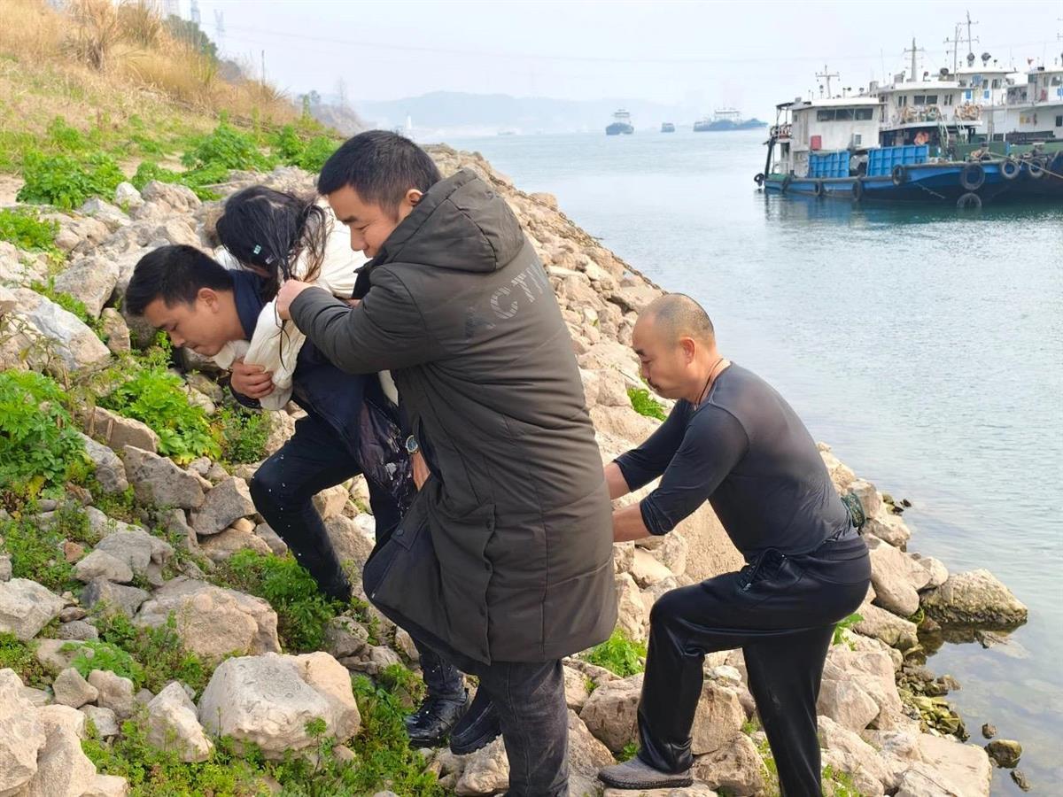 杜远华发现后,一边大声呼喊同事帮忙,一边火速取下趸船救生圈抛向女孩。同事谭虎龙当即取来竹篙参与救助。可女孩并不配合,危急时刻,另一名同事方琥纵身跳入冰冷江水中,奋力游向女孩。