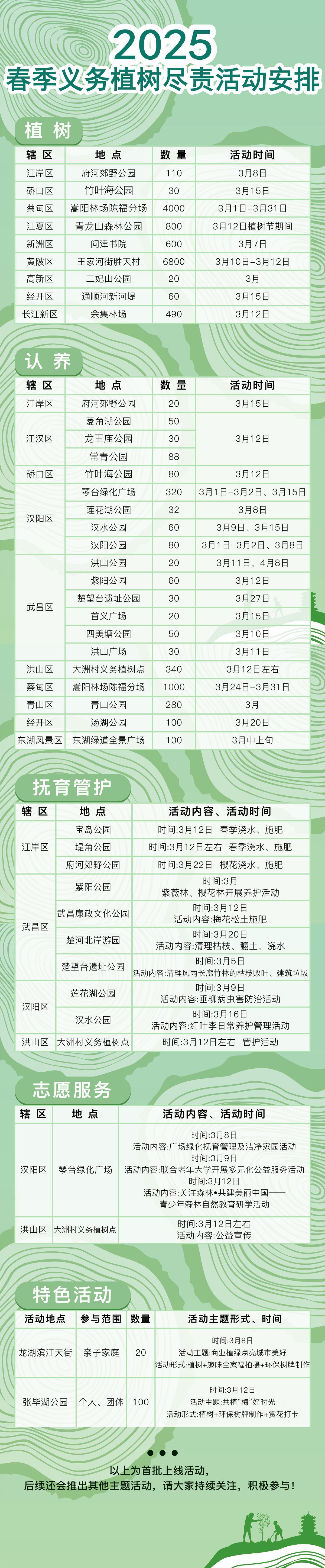义务植树报名渠道有两个,一是“绿小武”微信小程序,一是“武汉绿化”公众号。