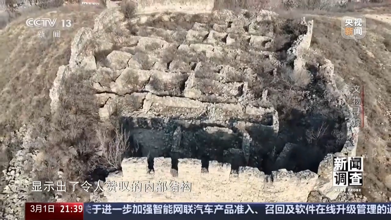 在倒塌的砖石下面,我们发现了构成山体的一层层青石板,与建设围子所用的材料完全一致。当时的村民应该是就地取材,建设了这座保护自身安全的防御设施。但是,这样一处在地面看过去显得凌乱无序的土围子,通过“四普”队员的航拍器,显示出了令人赞叹的内部结构。