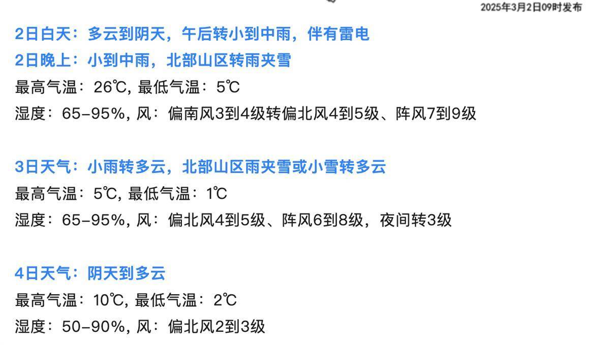 预计今明两天武汉市有一次寒潮大风降温降水过程,并伴有雷电,平均气温下降15℃~17℃,3日最低气温北部降至-1℃~1℃,南部1℃~3℃,其间伴有偏北风4~6级、阵风7~9级;3月4日至9日以阴天到多云天气为主,气温逐步回升。