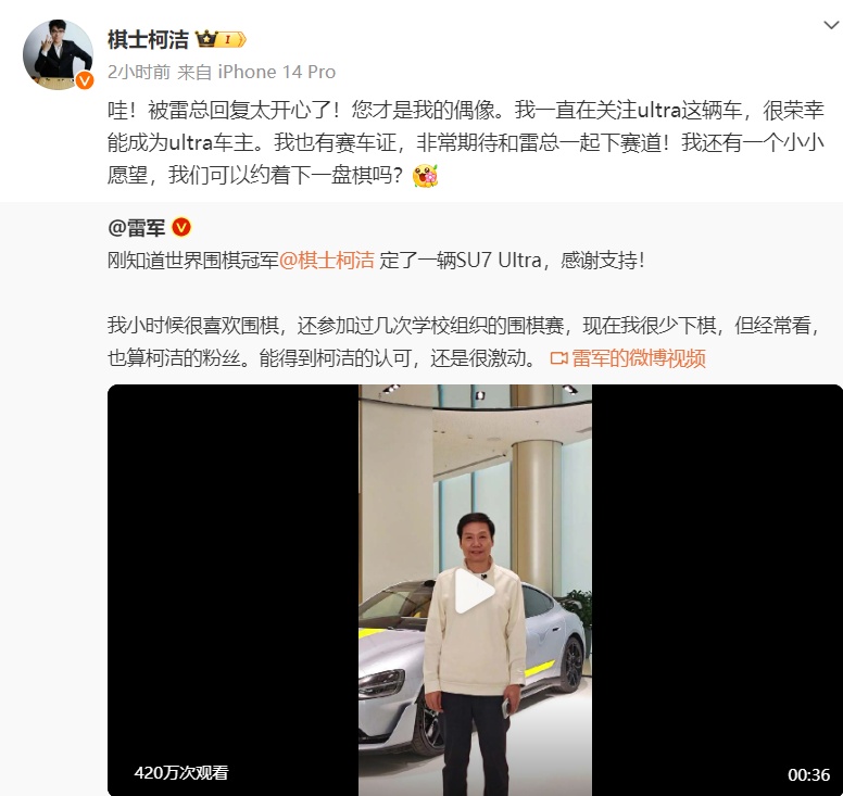 随后,柯洁也转发回应雷军,并称:哇!被雷总回复太开心了!您才是我的偶像。我一直在关注ultra这辆车,很荣幸能成为ultra车主。我也有赛车证,非常期待和雷总一起下赛道!我还有一个小小愿望,我们可以约着下一盘棋吗?