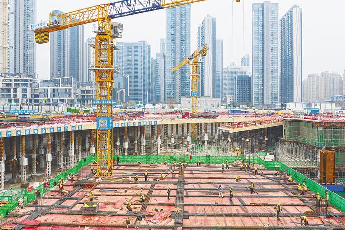 湖北日报讯 (记者马文俊、任勇、通讯员蔡沁)2月28日,江岸区汉口滨江国际商务区内,武汉周大福金融中心项目施工现场,机械运转不停歇,400余名工人奋战在作业一线。项目负责人介绍,该项目今年6月将完成地下结构施工,冲出“正负零”,进入地上施工新阶段。预计2030年建成交付,成为武汉重要的商业、办公新地标。
