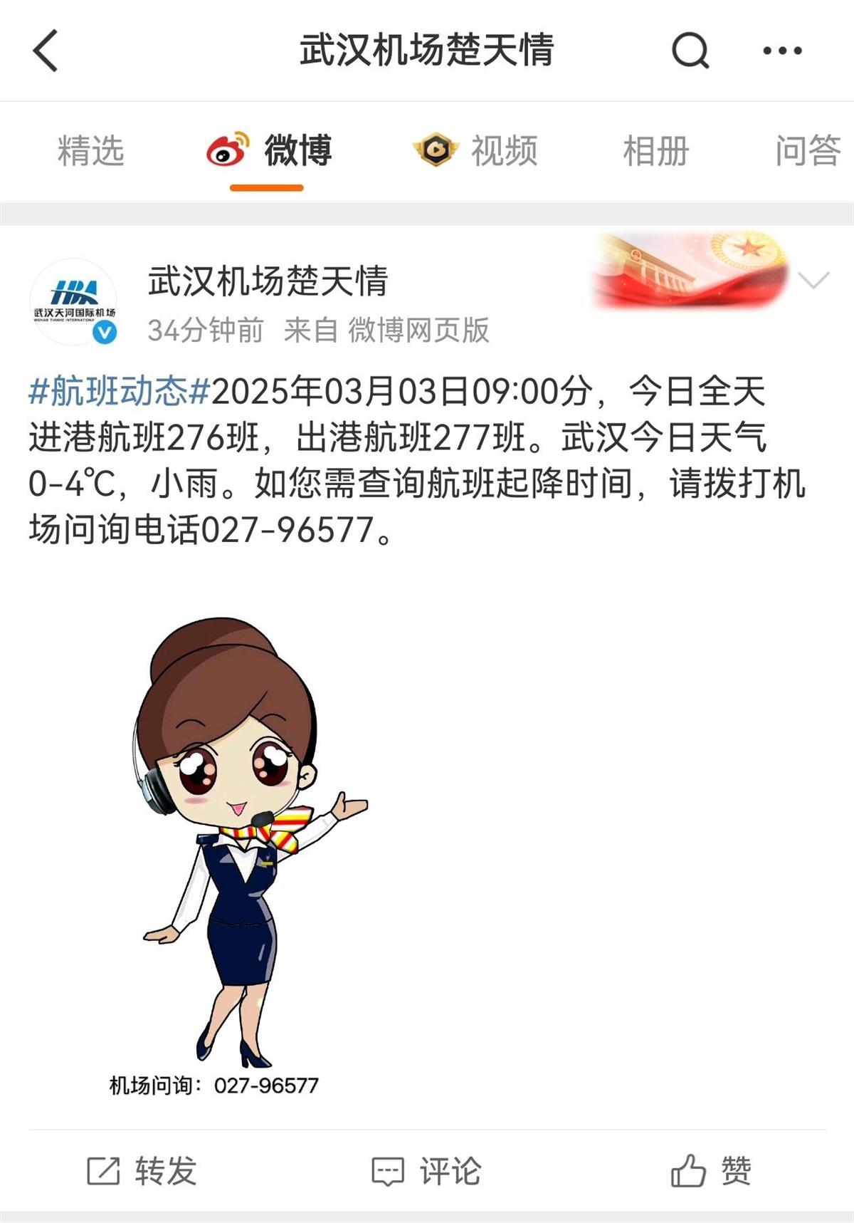 数据显示,2025年3月3日,武汉天河机场全天进港航班276班,出港航班277班。目前机场整体运行情况正常。