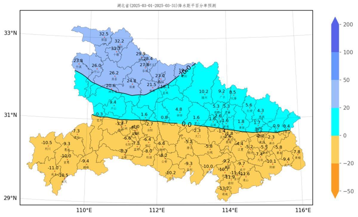 湖北省各县市2025年3月降水距平百分率预测图