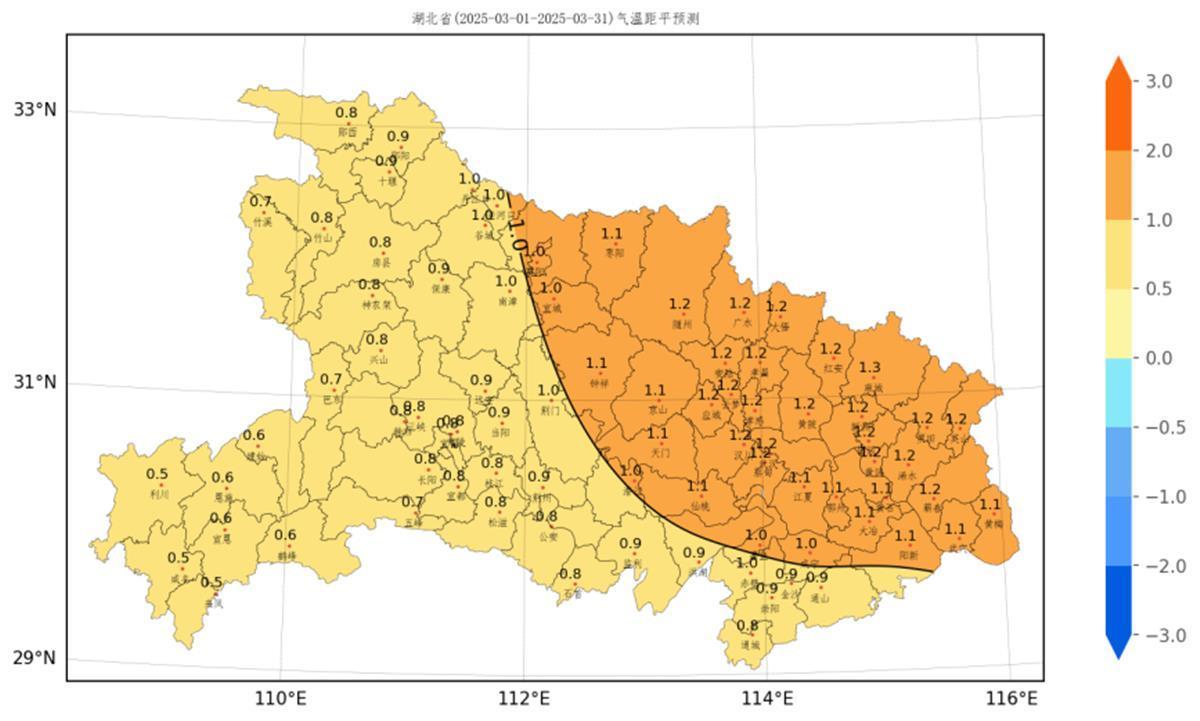 湖北省各县市2025年3月气温距平预测图