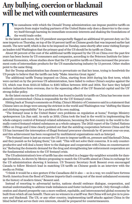 美国政府热衷于采用以邻为壑的手段减少自身损失,加征关税就是其中之一。此前,为躲过美国的关税攻击,墨西哥政府曾提议向中国征收与美国一致的关税。在上周五的媒体采访中,美国财政部长贝森特甚至鼓励加拿大跟随墨西哥的脚步向中国征税。