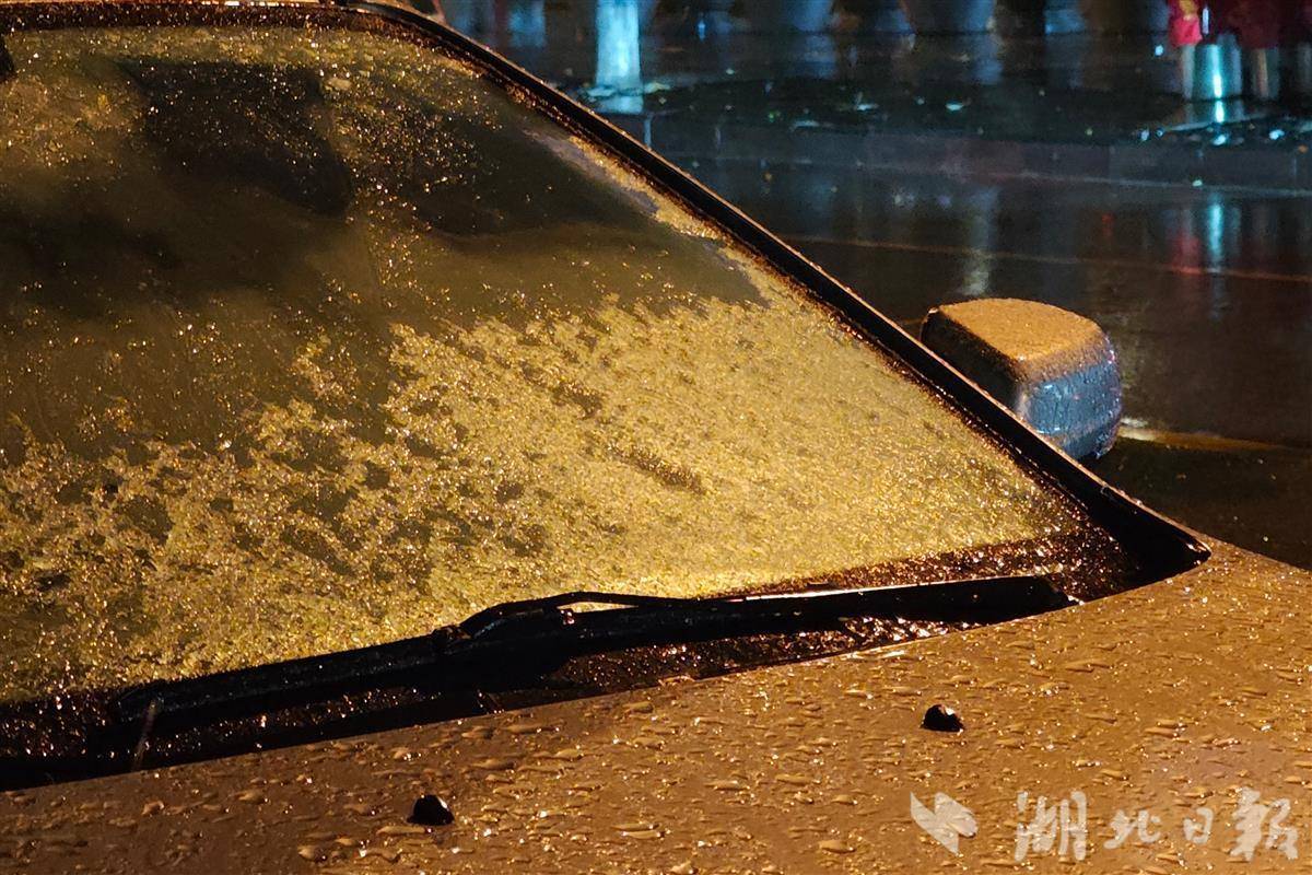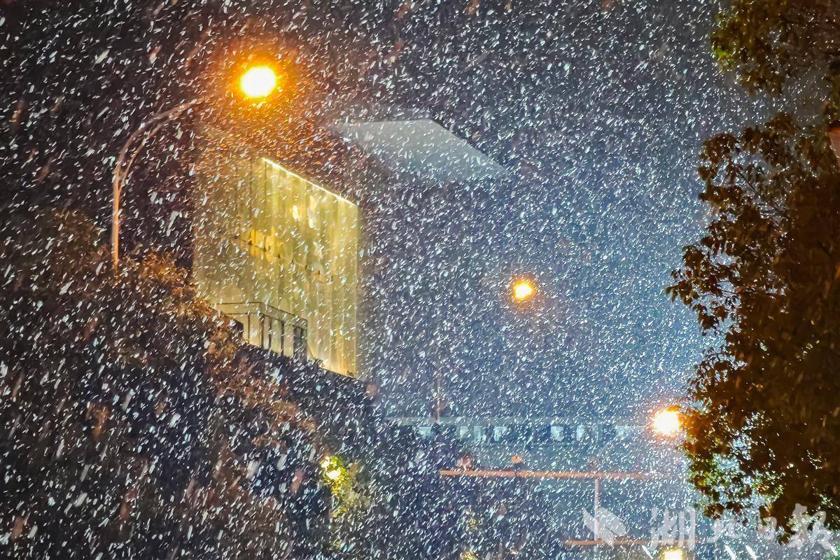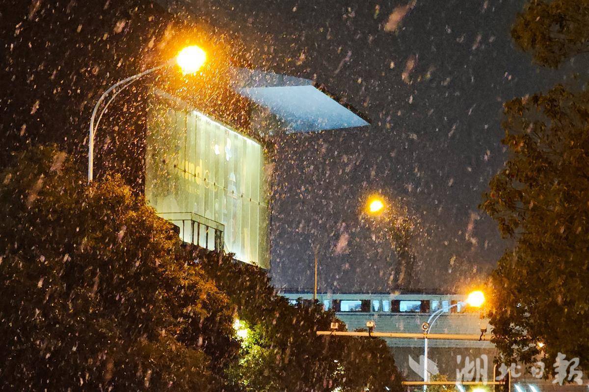 2025年3月3日晚,受强冷空气南下影响,武汉市区下起鹅毛大雪,在江岸区永泰路,大雪从路灯下飘过格外浪漫,部分路边车辆已出现明显积雪。(湖北日报全媒记者 何宇欣 摄)