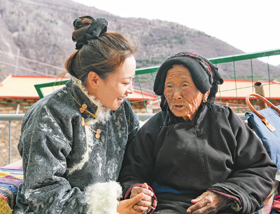 近日,全国人大代表、四川省马尔康市老年养护院院长格西王姆(左)走访乡村,倾听老人心声。新华社记者 王曦摄